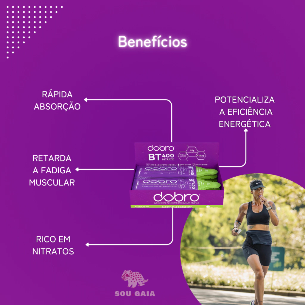 Com carboidratos, eletrólitos e 400mg de nitrato proveniente da beterraba, o BT Nitrato Gel foi formulado para atletas que buscam melhorar sua eficiência energética. Produtos de nutrição esportiva ricos em nitrato podem ter um impacto direto na eficiência energética e, como resultado, melhorar o desempenho do atleta, através do aumento de óxido nítrico e consequente melhora da circulação e redução do custo de oxigênio durante o exercício.