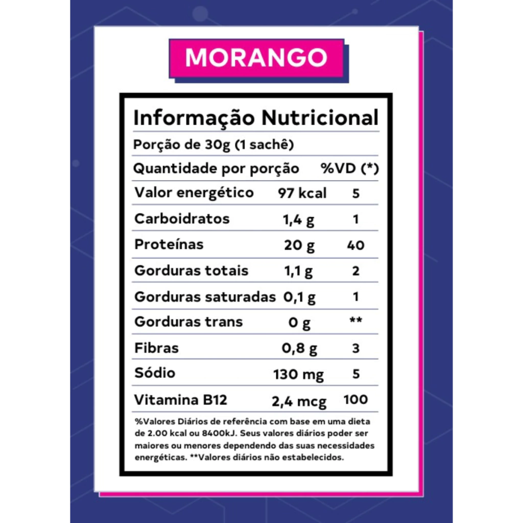 O produto é um suplemento alimentar de proteínas vegetais da marca Dobro, com sabor morango. A embalagem é rosa e possui a imagem de um papagaio verde. A descrição na embalagem inclui as seguintes informações: