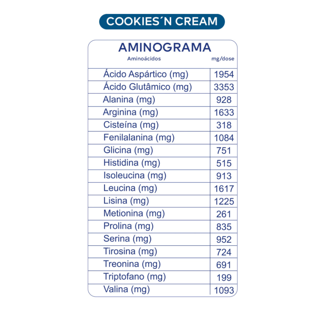 Ingredientes: Proteína da ervilha (Pisum sativum L.) isolada, proteína do arroz, leite de coco, proteína da lentilha (Lens culinaris Medik.) isolada, vitamina B12 (metilcobalamina), estabilizante goma guar, aroma idêntico ao natural de cookies e edulcorante estévia.